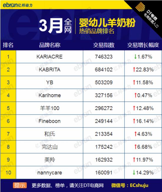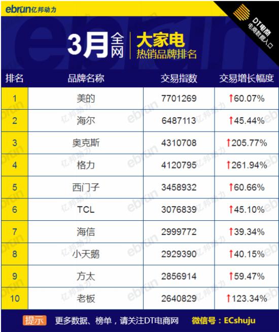 【编者按】】DT电商汇总了2017年3月份各大类目排名前十的全网热销品牌,仅供参考。其中,红色箭头表示上升,绿色箭头表示下降。