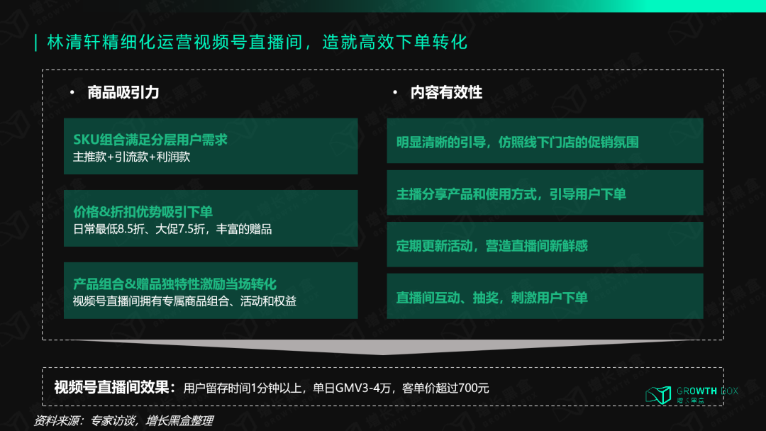 林清轩从2021年9月开始冷启动视频号直播,达到4个月直播GMV增长570%,[7]不到半年即稳定在每月80-100万GMV。平均用户时长超过1分钟,意味着直播间能够成功抓住用户的注意力。林清轩日常直播的场观平均每天维持在2万左右,大促期间高达10万/场,带来10-12w成交额。新老客比例也维持在比较健康的3:7左右。