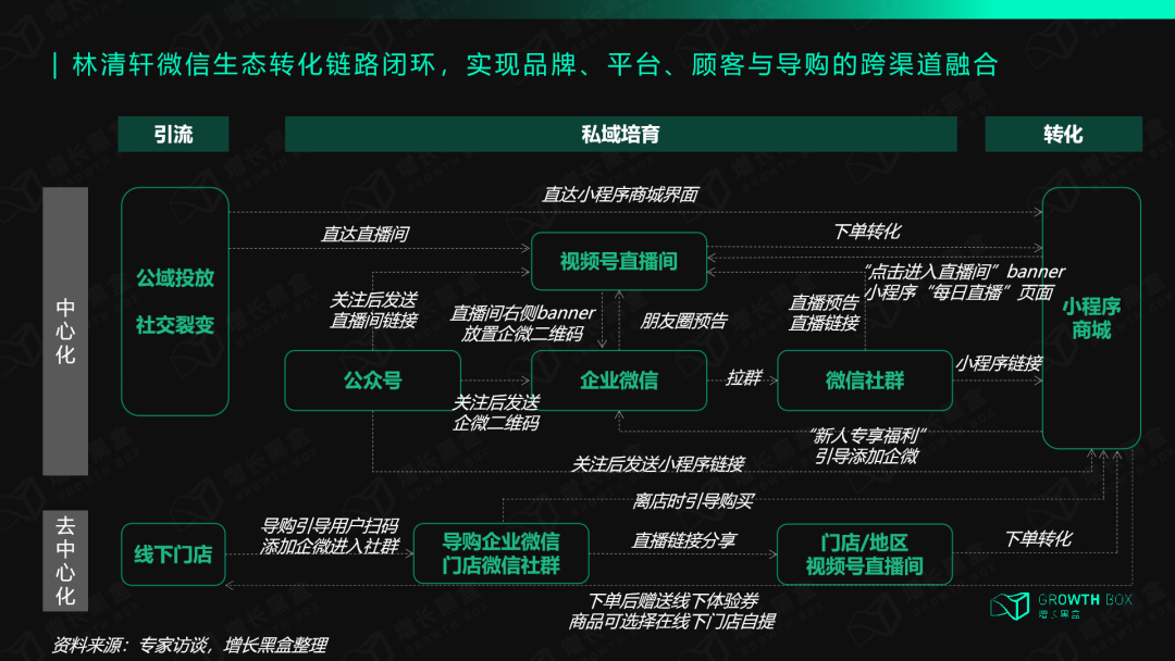 最后,要想形成闭环生态,就要用小溪把不同的池塘串联起来,让鱼可以在不同的池塘之间游动。林清轩的“鱼塘生态”,核心就是以微信为基础的,全域联动的智慧零售体系,而视频号直播就像不同池塘中新建的“交通枢纽”,使鱼儿的游动更加顺畅。