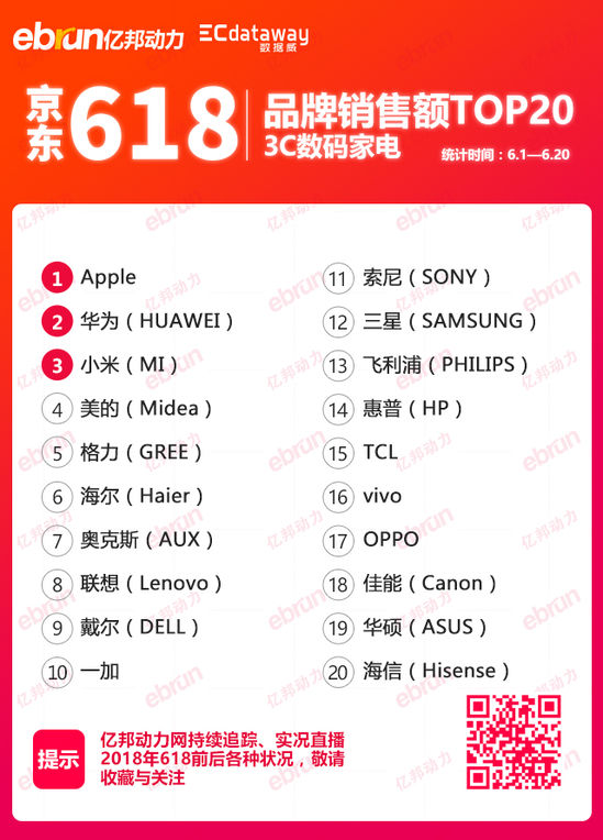 【亿邦原创】6月26日消息,亿邦动力联合数据威发布,在6月1日-6月20日期间,京东618 3C数码家电品牌销售额TOP20榜单。