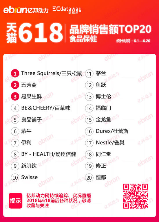 【亿邦原创】6月26日消息,亿邦动力联合数据威发布,在6月1日-6月20日期间,天猫618食品保健品牌销售额TOP20榜单。