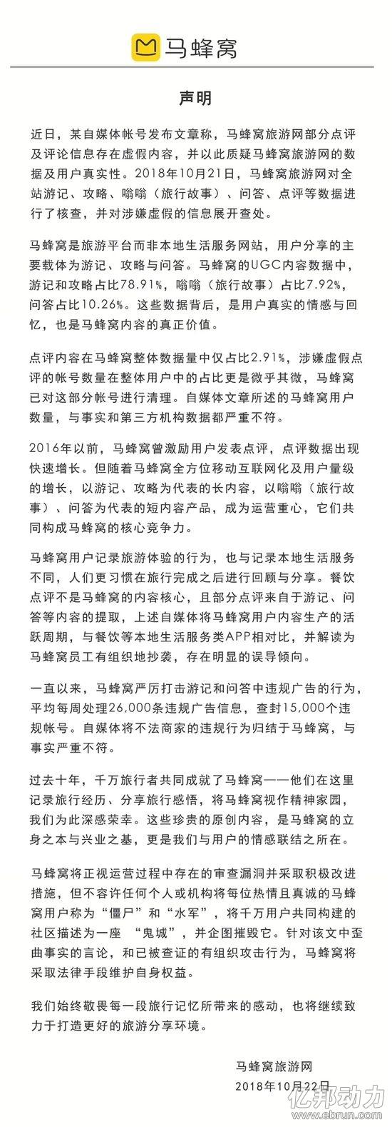【亿邦原创】10月22日消息,亿邦动力获悉,针对近日有自媒体帐号发布文章称“马蜂窝旅游网部分点评及评论信息存在虚假内容,并以此质疑马蜂窝旅游网的数据及用户真实性”,马蜂窝发布公告对此一事进行回应。