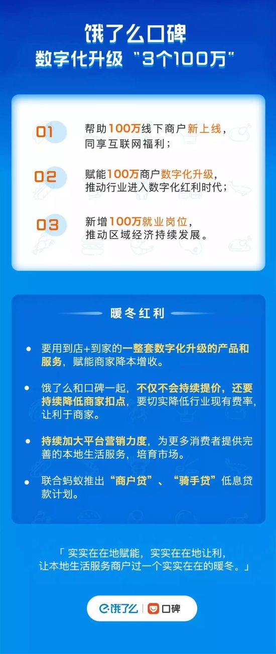 在赋能商户、为商户提供全套解决方案上,美团说了许多动听的话,但真正落实的却寥寥无几。率先打出实质举措的确是饿了么。在最近的“暖冬计划”中,王磊提出了激动人心的“3个100万”:帮助100万线下商户新上线;赋能100万商户普及数字化升级;2019年新增100万就业岗位。