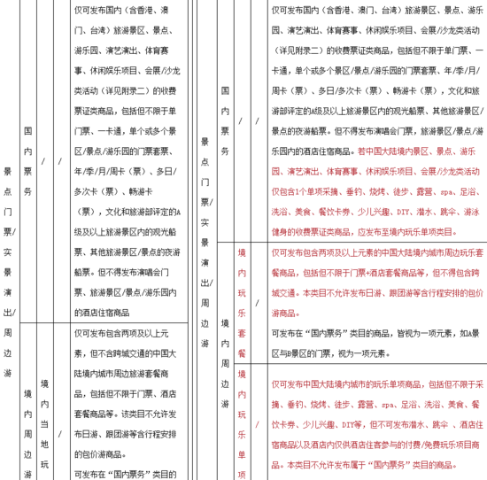 1、国内票务:若中国大陆境内景区、景点、游乐园、演艺演出、体育赛事、休闲娱乐项目、会展类活动仅包含1个单项收费票证类商品,应发布至境内玩乐单项类目;