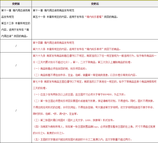 二、对《度假商品发布管理规范》进行了修订:新增境内周边游类商品发布规范