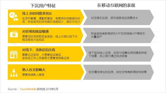 1、下沉用户移动互联网应用典型特征:杀时间需求突出,对价格和收益敏感、信赖线下、受他人影响大。很多应用正是抓住这些特点在下沉市场获得显著增长