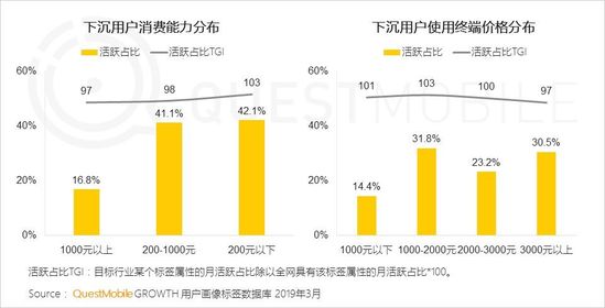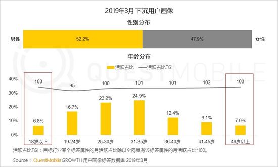 2、下沉用户18岁以下、46岁以上用户比重偏高,不排除是留守儿童和老人,手机成了其重要陪伴工具