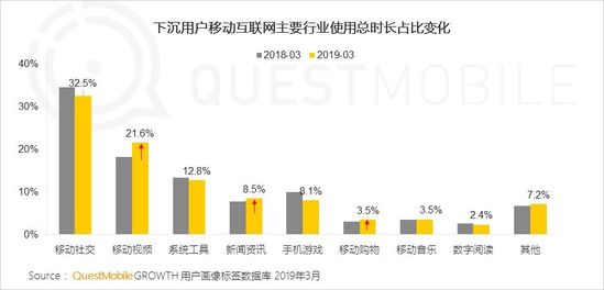 3、下沉用户的注意力分布:社交仍是花费时间最多的领域,但移动视频、资讯资讯、移动购物抢夺了越来越多注意力