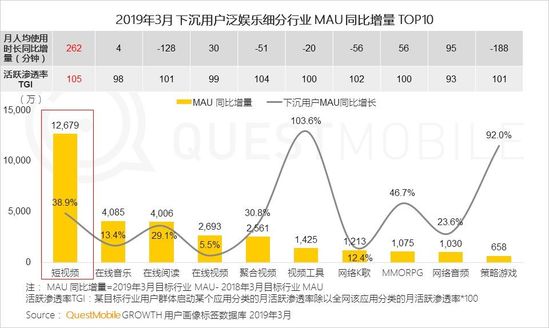 5、泛娱乐行业:满足了下沉用户杀时间需求,短视频成为下沉用户规模、时长增长最为突出的行业,在线音乐、在线阅读等也吸引了大量下沉用户