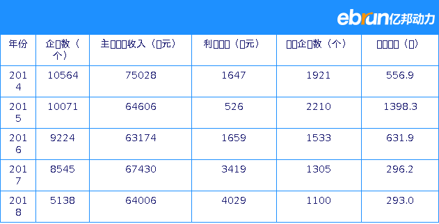 | 年份 | 企业数(个) | 主营业务收入(亿元) | 利润总额(亿元) | 亏损企业数(个) | 亏损总额(亿) |