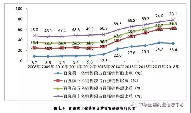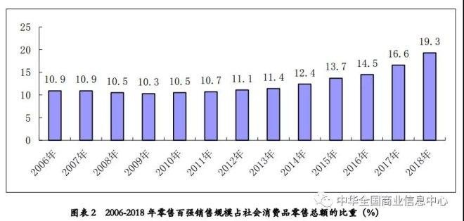2018年中国零售百强销售规模的较快扩张,使得百强销售规模占社会消费品零售总额的比重进一步提升。根据中华全国商业信息中心的统计,2018年百强销售规模占社会消费品零售总额的比重为19.3%,比2017年提高2.7个百分点。