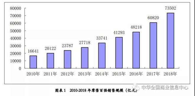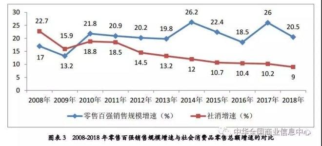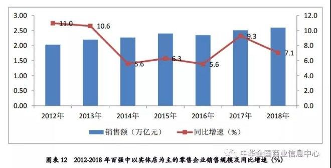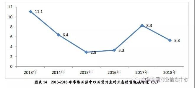 根据中华全国商业信息中心数据,2018年,零售百强中以百货为主的业态销售规模同比增长5.3%,增速低于去年同期3.0个百分点。