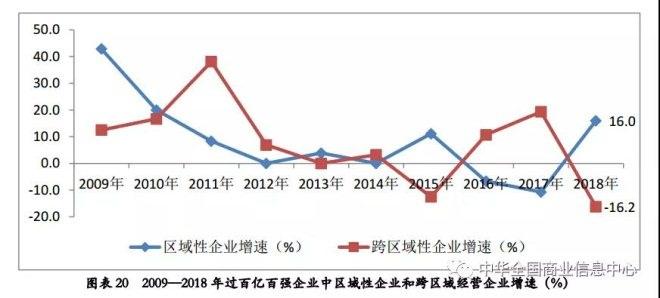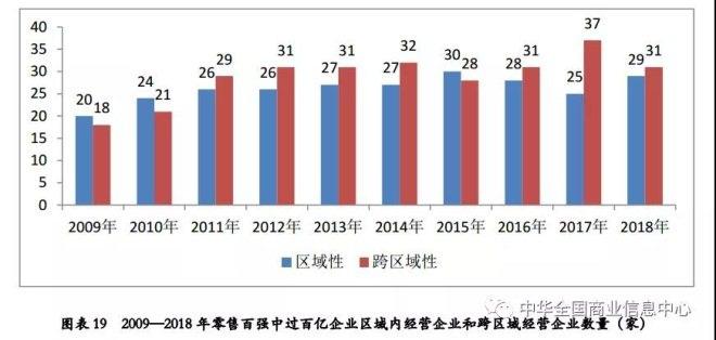随着近年消费品市场增速的平稳放缓,市场竞争的加剧以及零售市场渠道的分化,零售企业在市场布局上进一步巩固和稳定区域性市场,跨区域性市场扩张放慢。2018年零售百强过百亿的67家零售企业中,扣除其中7家网上零售企业,其余60家实体零售企业,有31家跨区域经营企业,29家区域内经营企业,与2017年相比,跨区域经营企业减少6家,区域内经营企业增加4家。31家跨区域企业零售规模增速同比下降16.2%,而区域性企业零售规模增速同比增长16.0%。