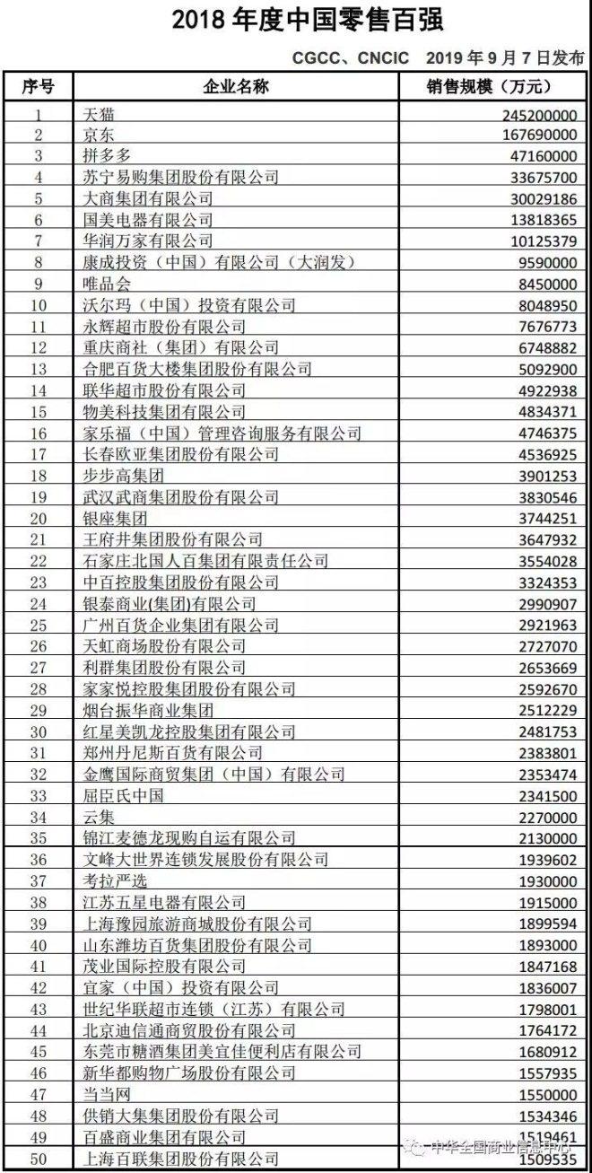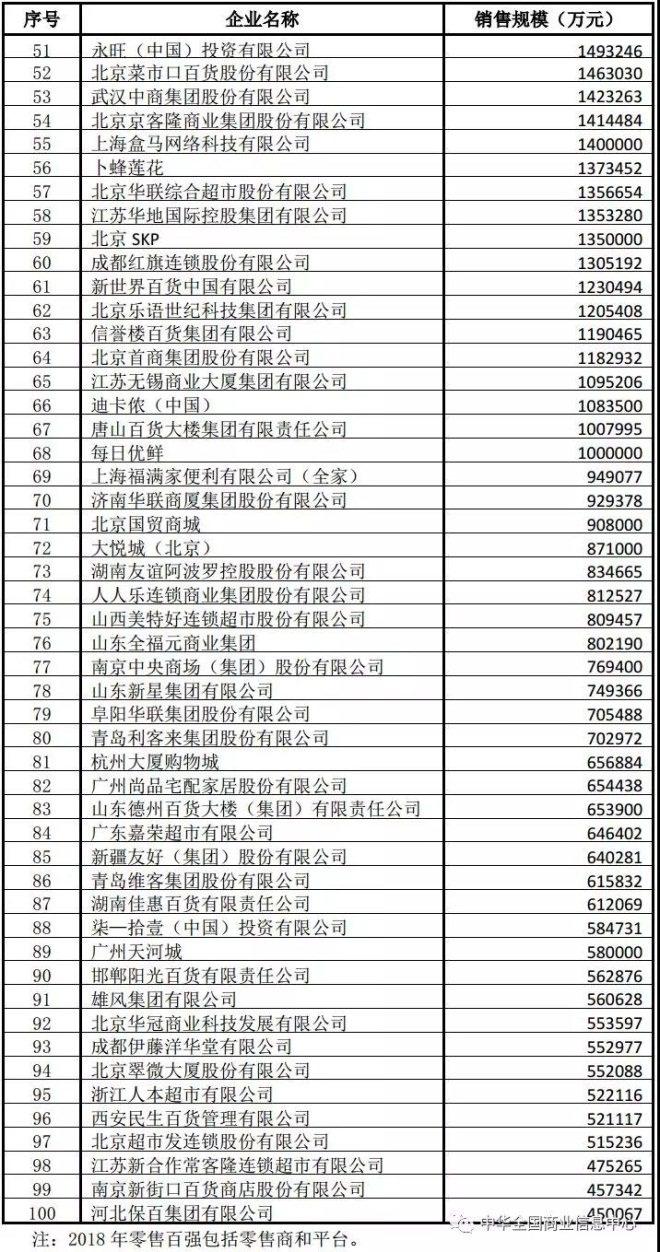 2018年,零售百强中,有7家企业销售规模过千亿,67家企业销售进入百亿团队,零售百强入围门槛为45亿元,比2017年提高0.2亿元。