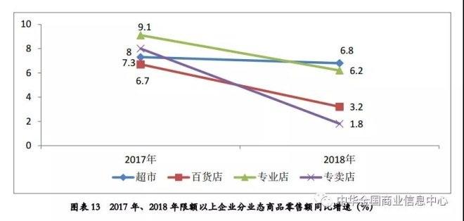 根据国家统计局数据,2018年,限额以上单位商品零售额中,超市、百货店、专业店和专卖店零售额比上年分别增长6.8%、3.2%、6.2%和1.8%,增速分别放缓了0.5、3.5、2.9和6.2个百分点。
