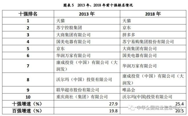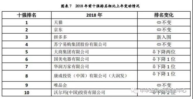 2018年入围零售百强的电商企业变换较大,拼多多、云集、每日优鲜等电商新业态迎合了新的潜在消费需求快速发展,为2018年新进入百强的企业。