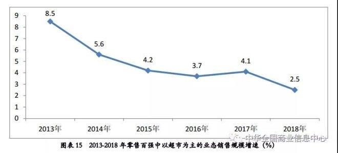 2018年,百强中以超市为主的业态同比增长为2.5%,增速低于上年同期1.6个百分点。百强中超市业态增速较低是因为线上超市、社区生鲜等新型超市业态的兴起,抢占了传统超市的市场份额,如盒马生鲜、每日优鲜2018年入围百强,且均实现了3位数的快速增长。