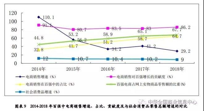 百强中电商销售规模增速也保持同样的增长趋势,近年百强中电商增速持续高于百强中实体店增速,且电商对百强增长的贡献率逐步提升,使得百强企业销售持续保持较快增长,零售百强从“实体拉动”到“电商拉动”的动力转变是百强增速持续较快的主要动因。