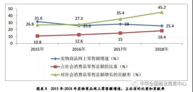根据国家统计局数据,2018年,社会消费品零售总额中网上实物商品零售额由于基数的扩大,增速有所回落,但增长速度仍明显快于实体店增速和社会消费品零售总额增速,对社会消费品零售总额增长的贡献率也继续提高。2018年,全国实物商品网上零售额同比增长25.4%,增速快于社会消费品零售总额增速16.4个百分点;占社会消费品零售总额比重为18.4%,比上年提高3.4个百分点;对社会消费品零售总额增长的贡献率为45.2%,比上年提高9.8个百分点;拉动社会消费品零售总额增长4.1个百分点,比上年提高0.5个百分点。