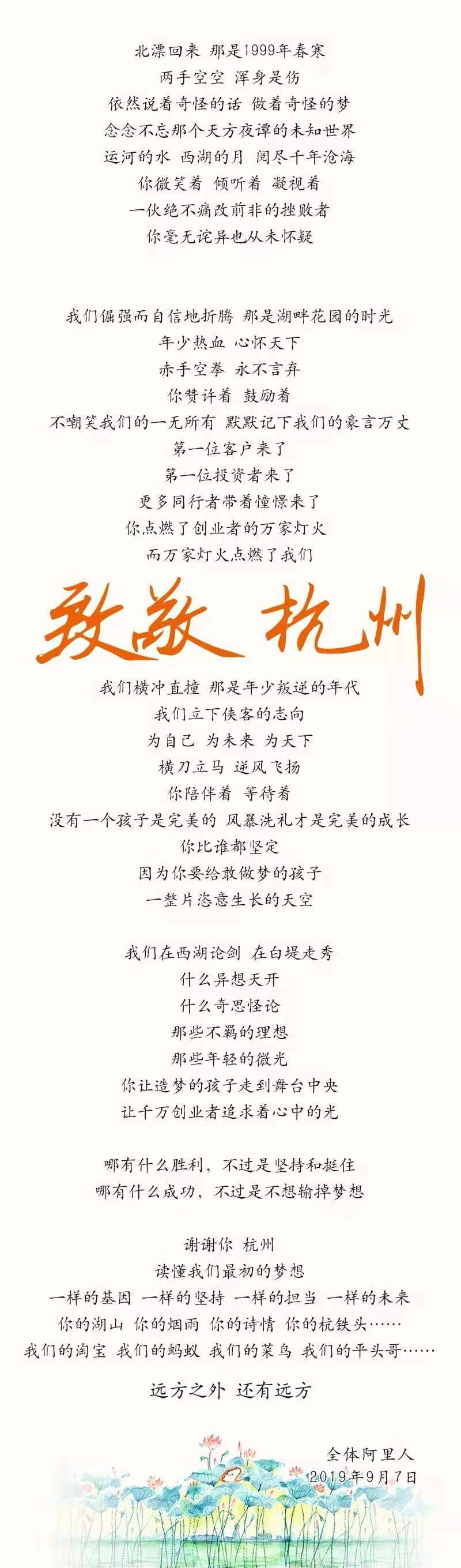 信中表示,从1999到2019,阿里巴巴始终与杭州血脉相连,阿里和杭州有着“一样的基因,一样的坚持,一样的担当,一样的未来”。