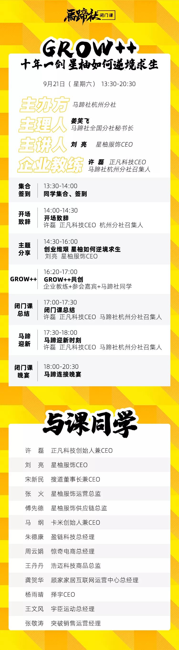 本次闭门课邀请到星柚服饰CEO刘亮作为分享嘉宾,马蹄社杭州分社部分同学和杭州地区多领域商业领袖和企业创始人齐聚一堂,就品牌企业如何逆境求生等话题展开讨论。