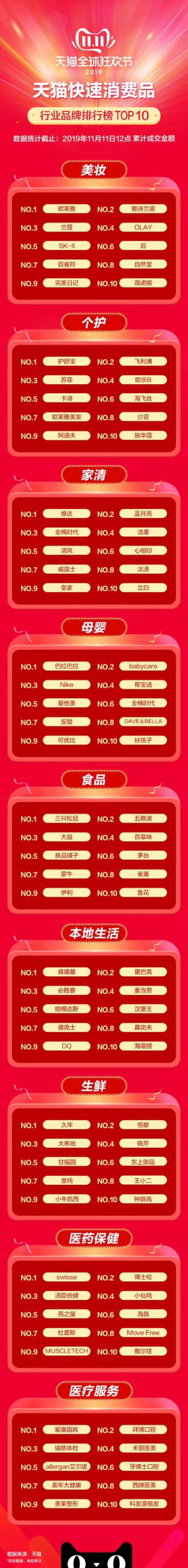 【亿邦原创】11月11日消息,截至12:00,天猫双11快消品行业品牌排行榜TOP10出炉(按累计成交金额排序)。