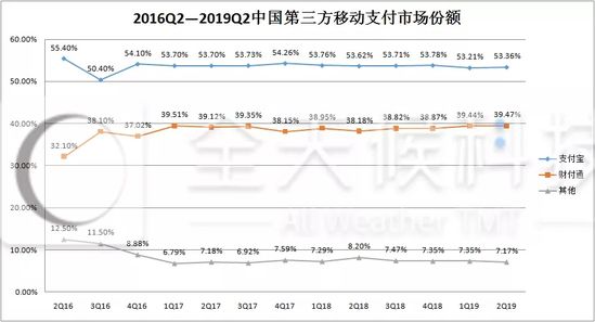 易观发布的第三方移动支付市场报告显示,2018年第一季度,支付宝市场份额为53.76%,高出第二名腾讯金融14.81个百分点;到了2019年第一季度,两者的差距略有缩小,为13.77个百分点。支付宝的市场份额遭到进一步挤压。