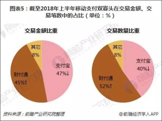 从交易金额的角度来看,前瞻产业研究院发布的数据显示,截至2018年上半年,支付宝和财付通的占比分别为47%和45%,已相当接近;以交易笔数计,支付宝和财付通的占比分别为40%和52%。