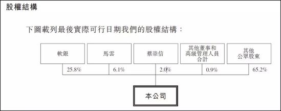 据阿里巴巴最新招股书,最大股东软银持股比例25.8%,马云持股6.1%,蔡崇信持股2.0%,其他董事和高级管理人员合计占股0.9%,其他公众股东持股65.2%。