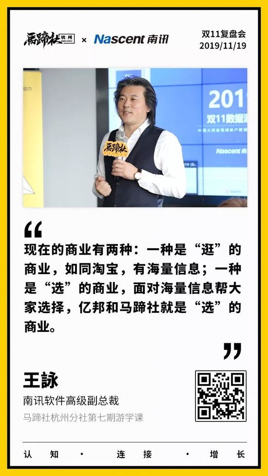 作为本次复盘会的东道主,南讯软件高级副总裁王詠与大家分享了最真实的双11大盘数据,同时也表达了作为一个电商行业老人与亿邦和马蹄社的感情。