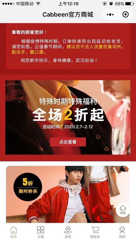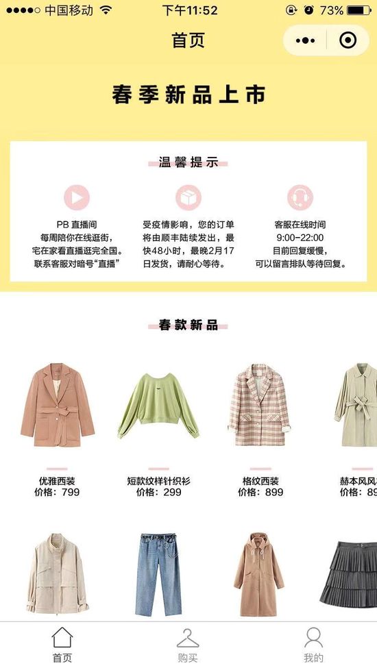 卡宾服饰品牌总监许少华表示,卡宾正利用已经搭建好的小程序微商城鼓励全员做线上销售,通过限时秒杀等活动,于2月9日取得交易额150万元的业绩。