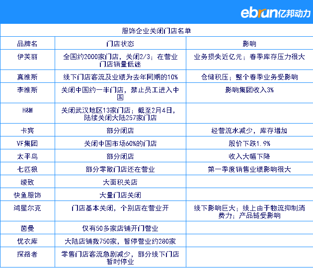 | 伊芙丽 | 全国约2000家门店,关闭2/3;在营业门店销量低迷 | 业务损失近亿元;春季库存压力很大 |