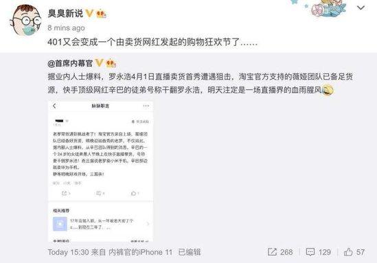 另有消息称,老罗直播卖货首秀遭遇狙击,淘宝官方支持的薇娅团队已备足货源,快手顶级网红辛巴的徒弟号称干翻罗永浩,所以老罗的这次直播“注定是一场直播界的血雨腥风”。