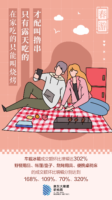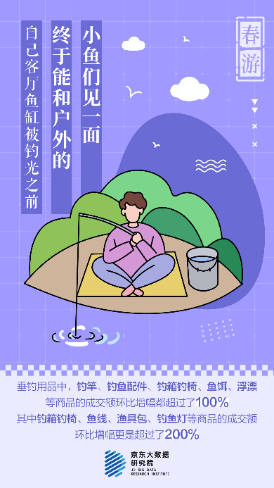 3、北京:春季踏青相关商品成交额排名全国第三位。消费者热衷的户外活动是垂钓,垂钓用品成交额环比增幅达278%,其中钓鱼配件、浮漂、垂钓辅助装备、鱼饵等商品的成交额环比增幅达329%、328%、485%、390%。运动类商品也取得了高速增长,运动服饰、运动鞋包、体育用品等商品成交额环比增幅都超过了80%。此外,竹签(烧烤用具)、帐篷、烧烤炉等户外用品的成交额环比增幅都超过150%。
