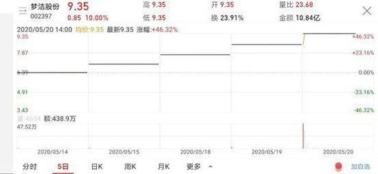 消息一出,梦洁股份的股价迎来暴涨,并在9个交易日里轻松斩获8个涨停板。5月20日,梦洁股份再次一字涨停,公司市值已经暴增34亿元,近乎翻倍,这一连串的疯狂表现令人咋舌。