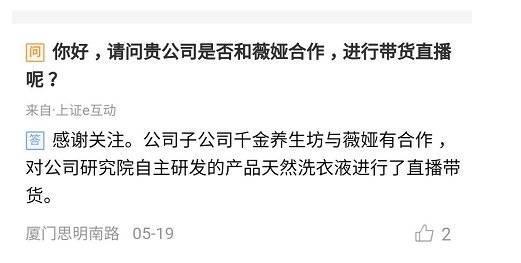 更让人咋舌的是,主播不仅能“带货”,还能“带股”,越来越多的上市企业开始蹭起了直播带货的热点。5月19日,千金药业接连发布多条互动信息确认:公司子公司千金养生坊与薇娅有合作,对公司研究院自主研发的产品天然洗衣液进行了直播带货。当天下午,千金药业股价直线拉升,大幅上涨3.38%,截至收盘,千金药业报收9.29元/股,上涨4.74%。