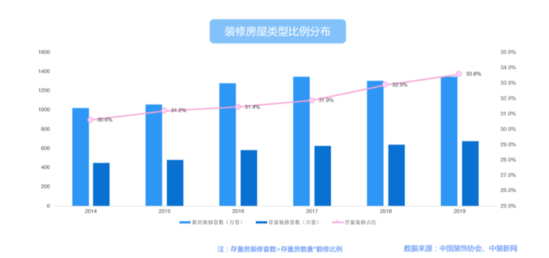 随着房地产行业前期的高速发展,中国已经全面进入存量房时代,二手房交易成为房产市场的新态势,同时也推动了家装行业进入装修存量房时代。数据显示,存量房装修占比逐年增高,2019年的存量房装修占比已经达到了33.6%。