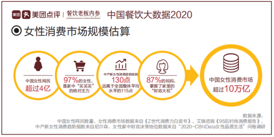数据显示,在4.67万亿的餐饮消费市场中,女性消费者占比60%,充分彰显了“她”经济效应。根据报告测算,中国女性消费市场规模可达10万亿以上, 值得全行业商家重点关注。