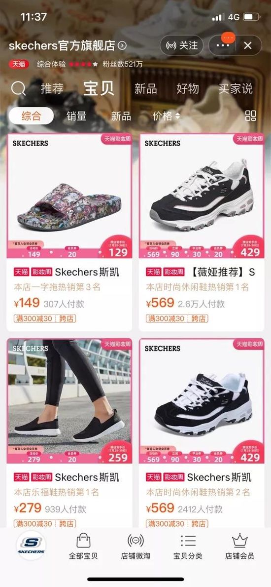 从妇女节、55购物节、618,再到现在,在天猫旗舰店、京东、微信商城和苏宁各个电商平台,斯凯奇打出了5折或更低的价格。天猫小二透露,在618期间,斯凯奇天猫旗舰店成交额同比增长了71%。