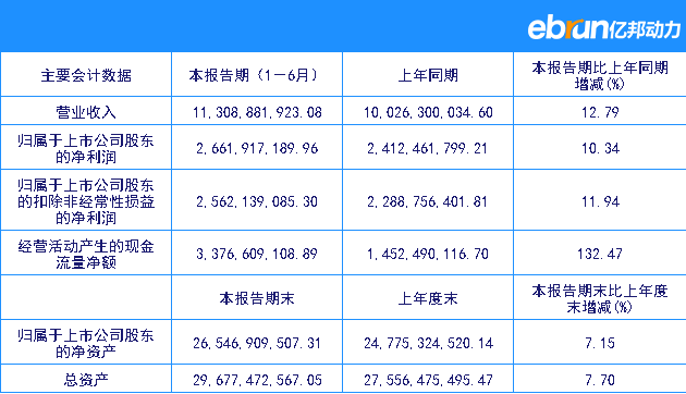 | 归属于上市公司股东的净利润 | 2,661,917,189.96 | 2,412,461,799.21 | 10.34 |