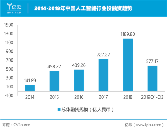 人工智能是近些年的投资“风口”,据研究,2018年突破1000家一级市场投资机构参与布局人工智能领域,2014年-2019年第三季度,人工智能行业总计共有2845起投融资时间发生,总计融资金额为3583.65亿人民币,远超大部分行业。
