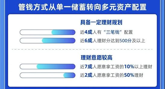 在理财用户中,近4成网上理财的用户已经有了把短期开销、保险保障和投资增值的钱作为“三笔钱”配置的习惯。这说明国人管钱方式正从单一储蓄,向理财、证券、基金等多元资产配置转型。