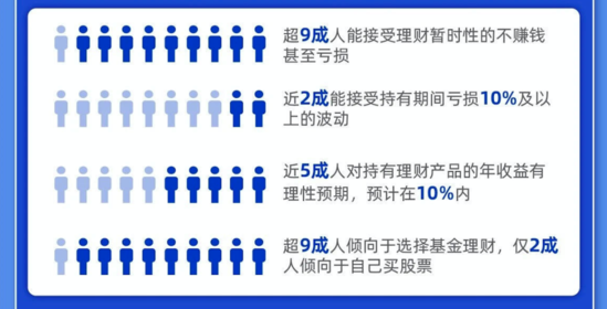 调研显示,超9成用户能接受理财不赚钱甚至亏损,近2成用户能接受持有期间亏损10%及以上的波动。大部分用户愿意通过专业机构参与证券市场,调研用户中超9成倾向于选择基金理财,仅2成倾向于自己购买股票。近5成用户对持有理财产品的年化收益有理性预期,预计在10%以内。看得出来,大部分用户也在逐渐接受理财不等于稳赚不赔。