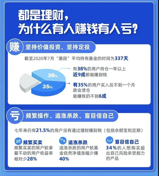 报告中提到,有78.5%的用户通过理财获利,而仍有21.5%的用户没有通过理财赚到钱。未获利的背后有以下原因:一是频繁买卖的用户,较长期持有的用户收益率少28%;二是追涨杀跌的用户,较基金自然净值涨幅少赚40%;三是盲目自信,34%的人想购买超出个人风险承受能力的产品。