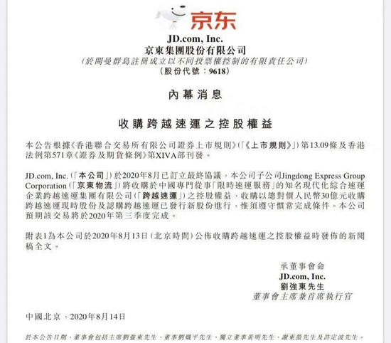 【亿邦原创】8月14日消息,日前,京东集团发布公告称,已于2020年8月订立最终协议,子公司京东物流将收购综合速运企业跨越速运的控股权益,以总对价30亿元人民币收购跨越速运现时股份及认购跨越速运已发行新股份进行,预计该交易将于2020年第三季度完成。