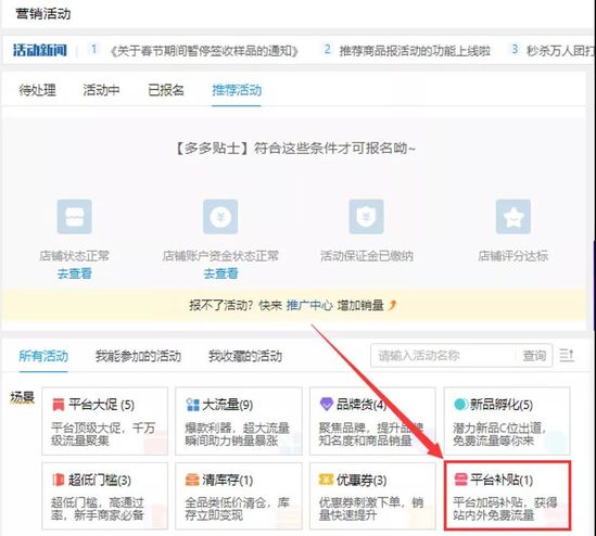 拼多多有意降低商家参与百亿补贴门槛,只要店铺状态、资金状态正常并缴纳保证金,商家即可申请参与百亿补贴活动。补贴款可以选择以推广红包或者货款汇入的形式发放,百亿补贴的活动价不会计入商品历史最低价。