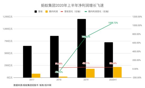 2018年首次利润下滑后,2019年蚂蚁集团实现净利润180亿元,同比2018年增长超7倍,比2017年也增长1倍以上。2020上半年,蚂蚁利润增长再次提速,实现净利润219亿元,超过2019全年。