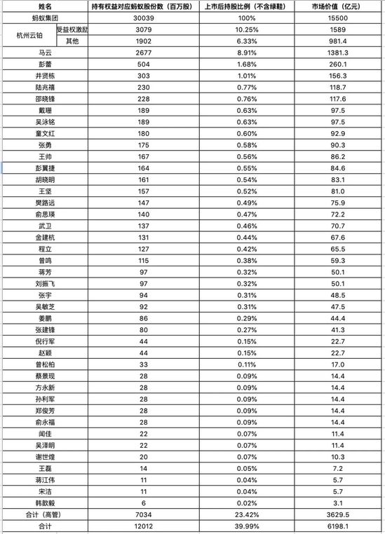 根据招股书,包括马云、彭蕾、井贤栋在内的40位蚂蚁集团和阿里系高管,合计持有约70.34亿股,上市后市场价值约3630亿元。不计算马云个人财富的情况下,蚂蚁上市将诞生至少4位百亿富翁和35位十亿富豪。