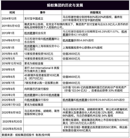首先是大股东阿里巴巴。马云于2011年将蚂蚁集团的前身支付宝以3.3亿元的价格从阿里剥离。为了补偿股东,蚂蚁与阿里巴巴集团2014年签署了一项协议,上市前阿里巴巴集团有权购买其33%的股权。