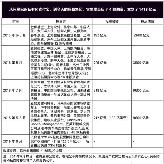 投中网根据蚂蚁集团招股书梳理,从2015年2019年,剔除与阿里巴巴集团的股票和知识产权置换,蚂蚁集团经历了4轮融资,累计拿到了1413亿元的融资。除社保基金外,蚂蚁集团背后的投资人包括国开金融、建行旗下中投海外和建信信托、中国人寿、中邮集团等50位机构投资者。